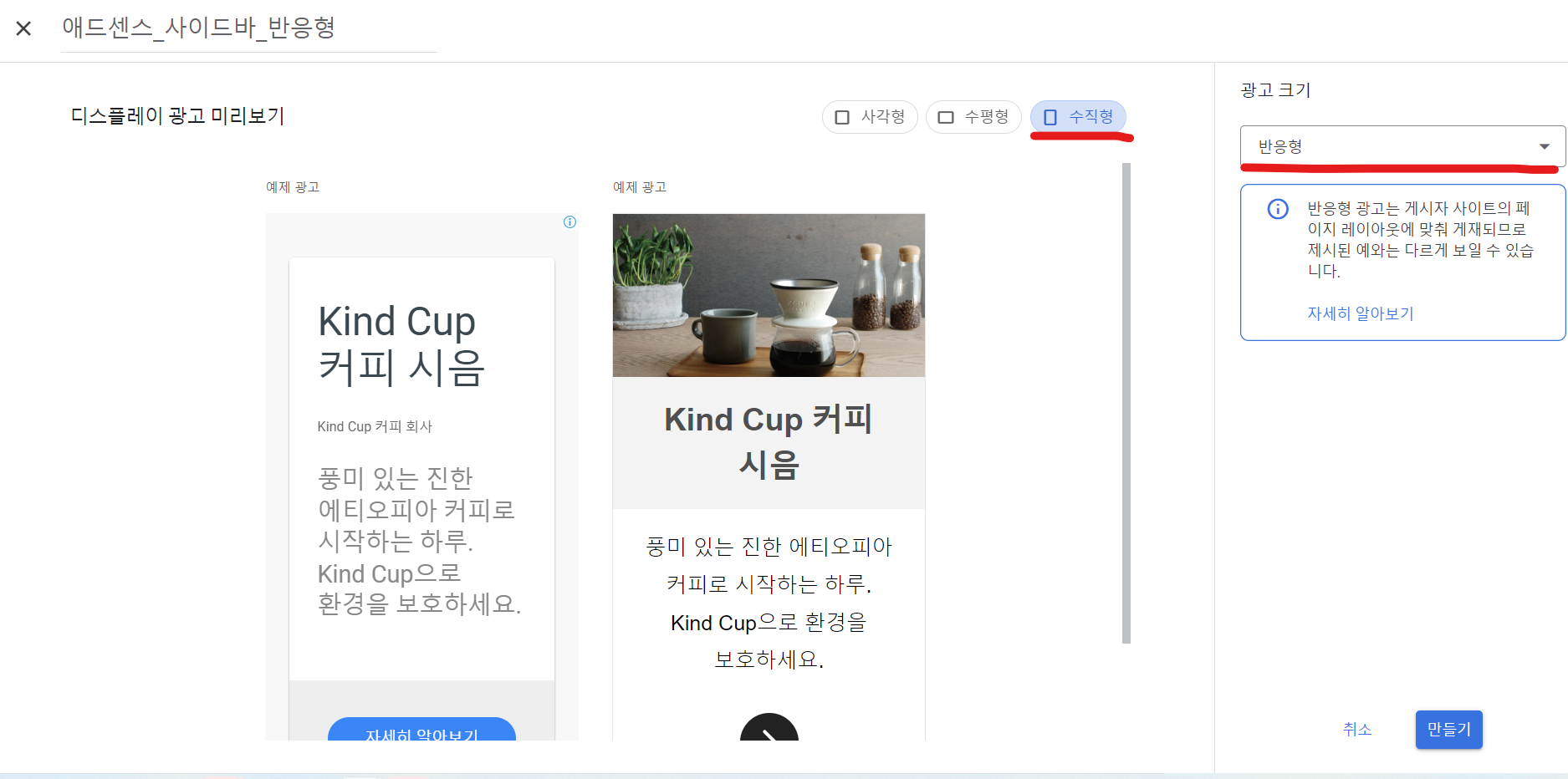 3. 사이드바에 광고를 삽입할 것이니 형태는 수직형으로, 광고 크기는 반응형으로 선택 후 만들기 클릭