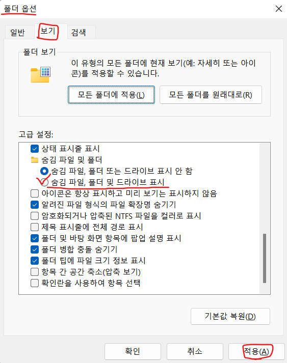 폴더 옵션에서 보기 -> 고급설정에서 스크롤을 내려 -> 숨김 파일 및 폴더에서 숨김 파일, 폴더 및 드라이브 표시를 선택 후 적용합니다.