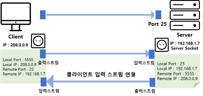 하나의 소켓에 동시에 2개의 컴퓨터가 연결 된다면 데이터가 섞이기 때문에 동시에 연결될 수는 없다.
