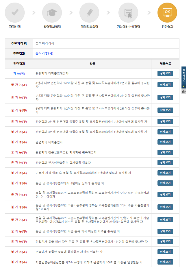 진단 결과란에 하나라도 가능 이라는 표시가 있다면 응시가 가능합니다.