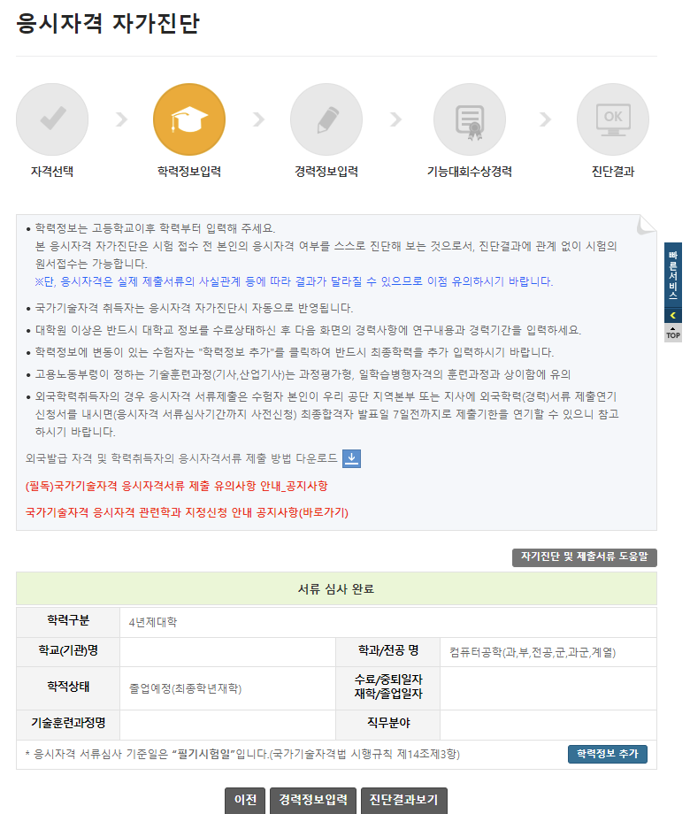 「응시자격 제출서류」 를 스스로 진단하고 안내 받을 수 있는 서비스 입니다.