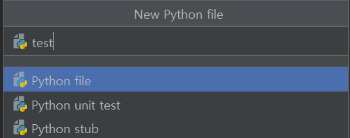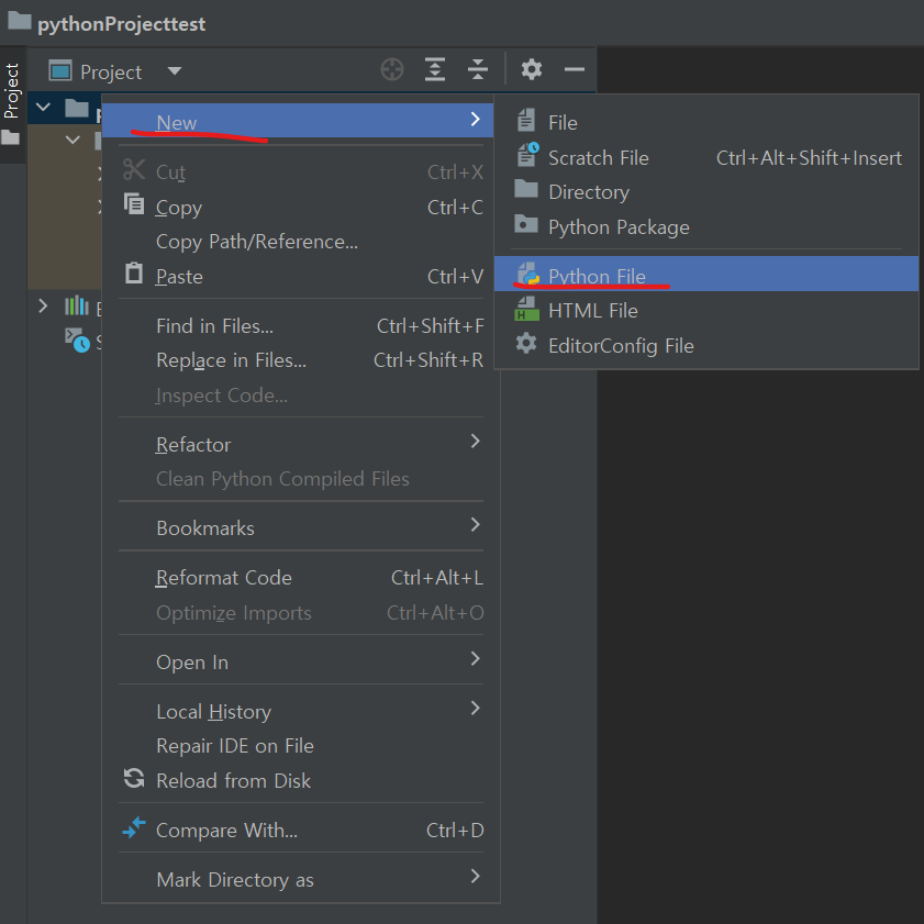 생성된 프로젝트 이름에서 오른쪽 버튼 클릭 후 New> Python File 클릭
