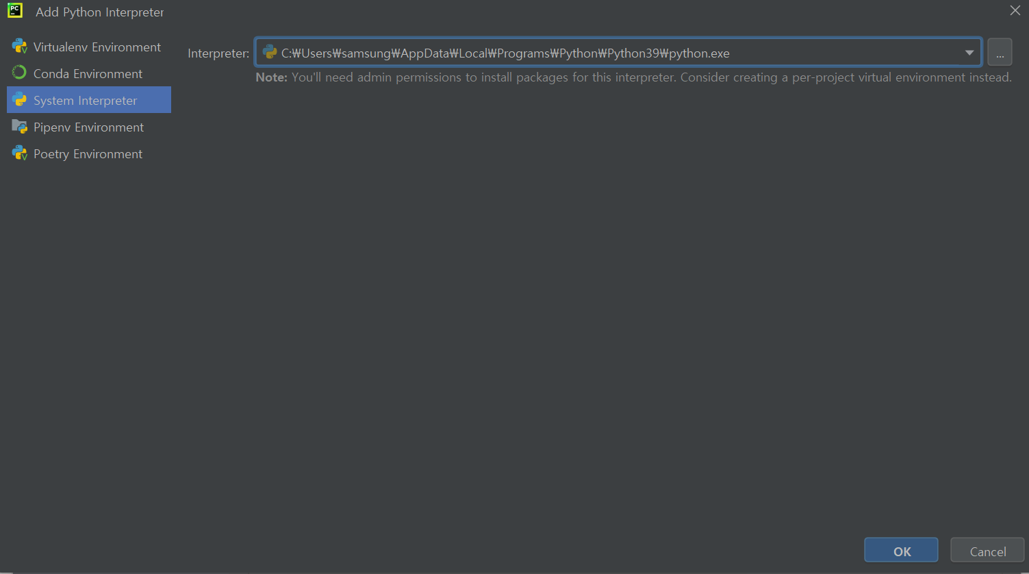 왼쪽 메뉴에서 System Interpreter 클릭 > 인터프리터 선택 후 ok 클릭