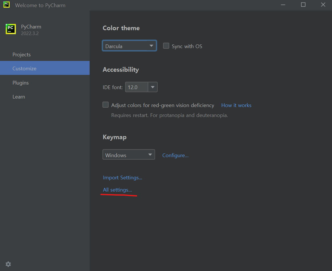 Project Interpreter가 Python으로 설정되어 있는 것을 확인 후 Ok 클릭