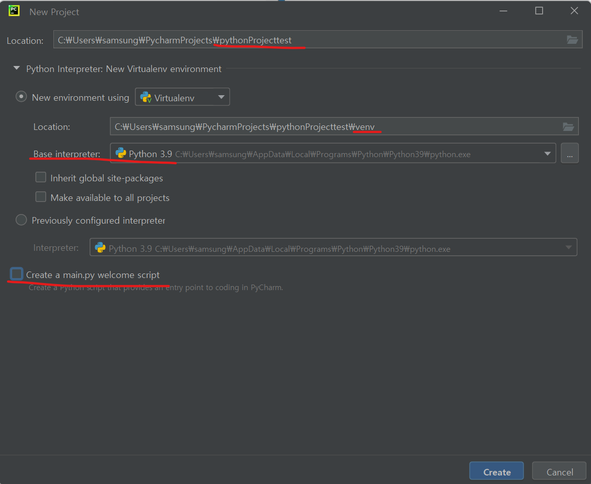 ※ Location 파일 경로에 venv로 끝나는지 확인해야합니다.