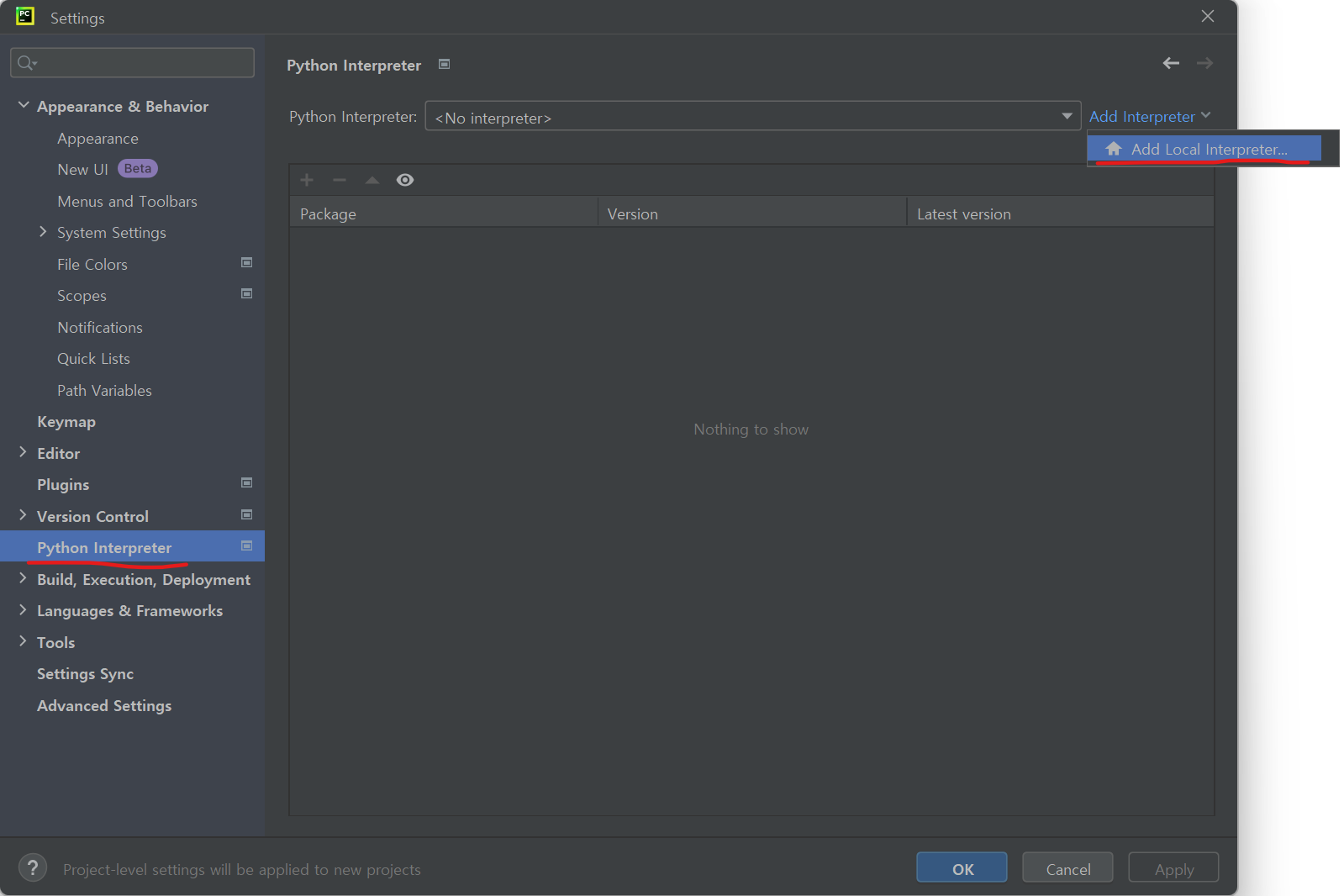 Settings > Python Interpreter 클릭 > Add Interpreter 클릭 > Add Local Interpreter 클릭