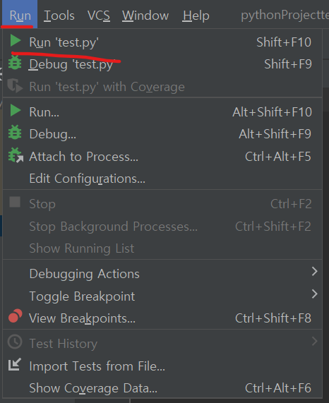 상단 메뉴에서 Run > Run 'test.py' 클릭